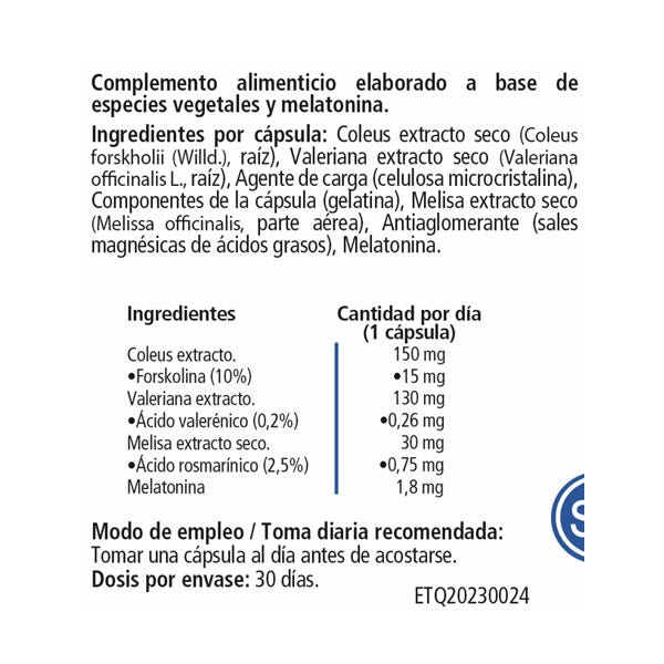 Ingredientes por cápsula: Coleus extracto seco (Coleus forskholii (Wild), raíz), Valeriana extracto seco (Valeriana officinalis L, raíz), Agente de carga (celulosa microcristalina), Componentes de la cápsula (gelatina), Melisa officinalis extracto seco (Melisa officinalis, parte aérea), Antiaglomerante (sales magnésicas de Ácidos grasos), Melatonina.