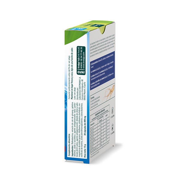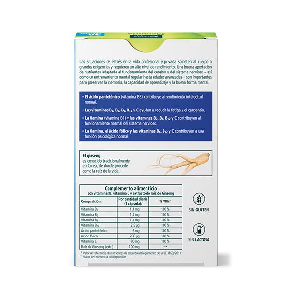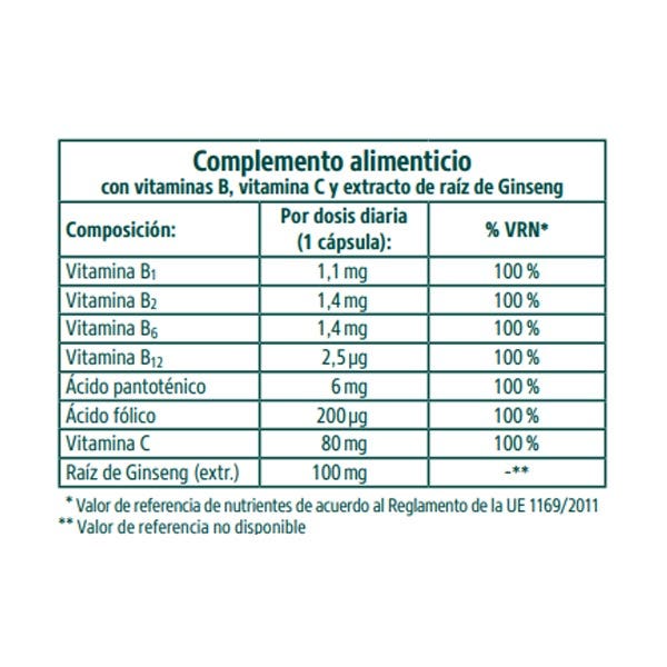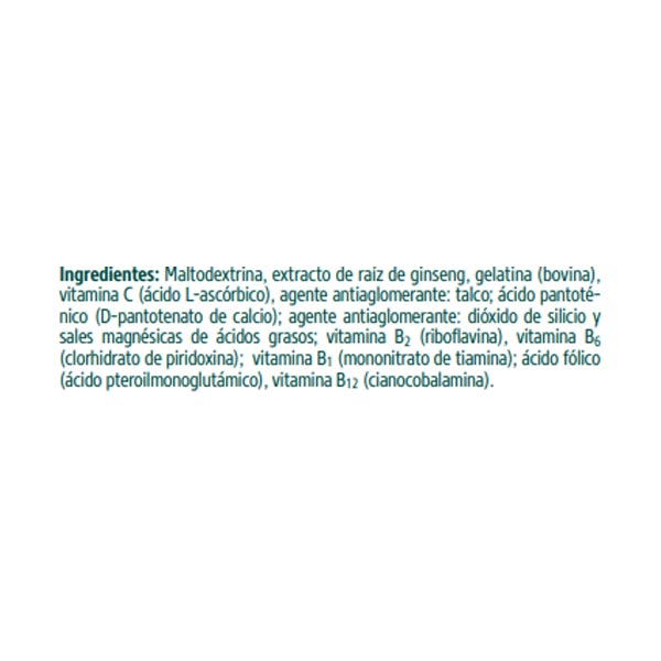 Ingredientes: Maltodextrina, extracto de raíz de ginseng, gelatina (bovina), Vitamina C (ácido L-ascórbico), agente antiaglomerante: talco; ácido pantoténico, (D-pantotenato de calcio); agente antiaglomerante: dióxido de silicio y sales magnésicas de ácidos grasos; vitamina B2 (riboflavina), vitamina B6 (clorhidrato de piridoxina); vitamina B1 (mononitrato de tiamina); ácido fólico (ácido pteroilmonoglutámico), vitamina B12 (cianocobalamina).