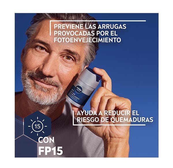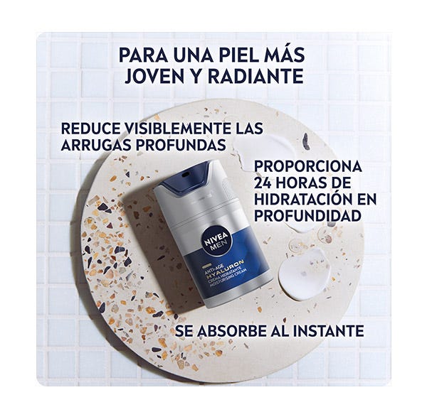 ¿Signos de envejecimiento? NIVEA MEN Hyaluron Crema Hidratante Antiedad FP15 con Ácido Hialurónico es el producto de cuidado facial perfecto para un mostrar un aspecto saludable y más joven.