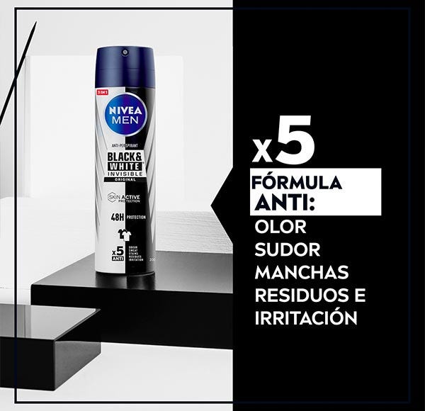 NIVEA MEN Black & White Invisible Original es un desodorante que ofrece protección con 5 beneficios en 1. Desarrollado en colaboración con los expertos en textiles del Instituto Hohenstein, esta gama de desodorantes ofrece resultados antitranspirantes de alta eficacia además de proteger de las MANCHAS para mantener el color original de la ropa clara y oscura. Bloquea el OLOR con sus poderosas fragancias, evita el SUDOR durante 48 horas de eficacia antitranspirante, no deja RESIDUOS en la piel ni en la ropa y previene las IRRITACIONES de la piel porque su fórmula única se ha optimizado para el uso diario. En resumen: es el compañero perfecto para mantener protegida tanto tu piel como tu ropa favorita en cualquier situación.