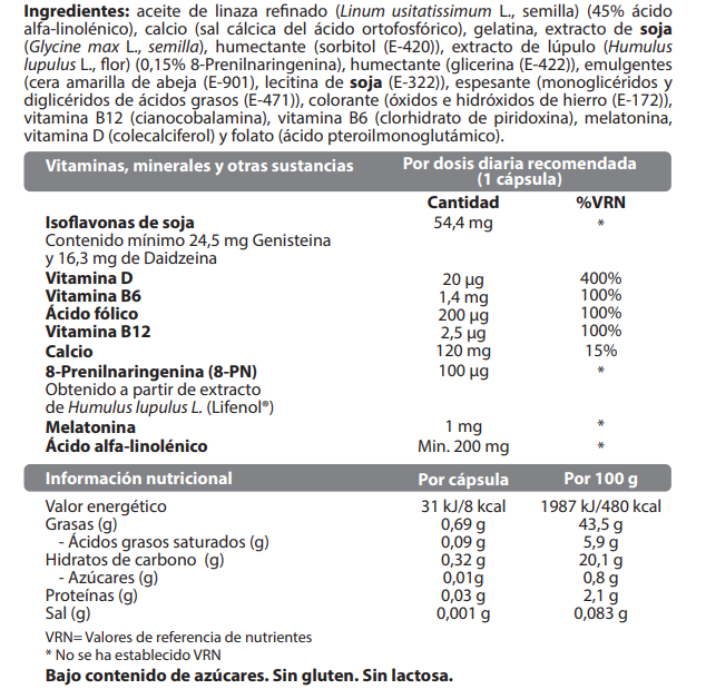 Ingredientes: aceite de linaza refinado (Linum usitatissimum L., semilla) (45% ácido alfa-linolénico), calcio (sal cálcica del ácido ortofosfórico), gelatina, extracto de soja (Glycine max L., semilla), humectante (sorbitol (E-420)), extracto de lúpulo (Humulus lupulus L., flor) (0,15% 8-Prenilnaringenina), humectante (glicerina (E-422)), emulgentes (cera amarilla de abeja (E-901), lecitina de soja (E-322)), espesante (monoglicéridos y diglicéridos de ácidos grasos (E-471)), colorante (óxidos e hidróxidos de hierro (E-172)), vitamina B12 (cianocobalamina), vitamina B6 (clorhidrato de piridoxina), melatonina, vitamina D (colecalciferol) y folato (ácido pteroilmonoglutámico).
