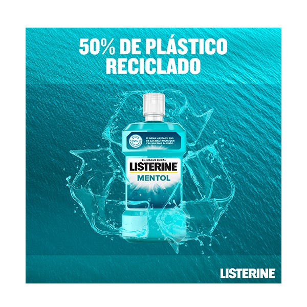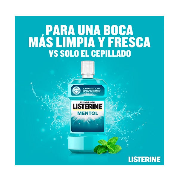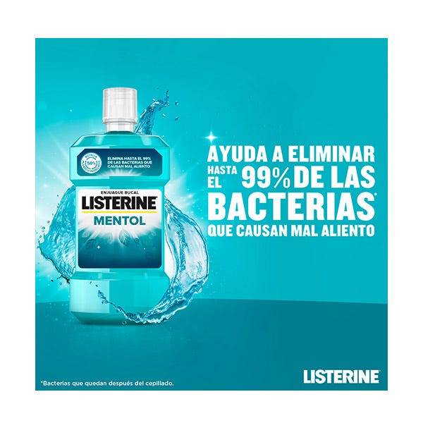 -Listerine Menthol para una boca más limpia y fresca que el cepillado solo mata hasta el 99% de las bacterias que causan el mal aliento. Brinda protección las 24 horas contra la placa y la tranquilidad de un aliento fresco duradero.