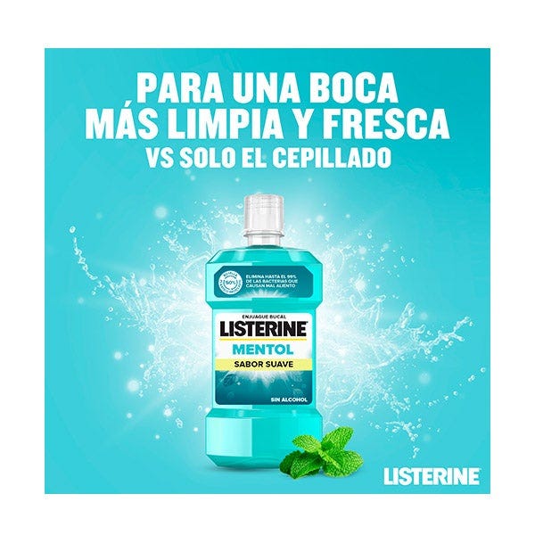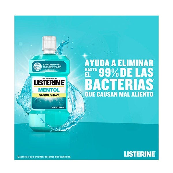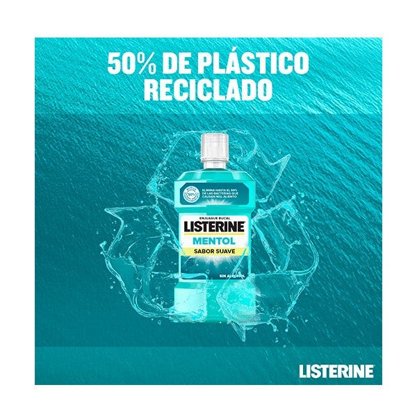 Gracias a su fórmula basada en aceites esenciales con flúor y sin alcohol, el enjuague bucal Mentol Suave proporciona 24 horas de protección contra la placa y la tranquilidad de un aliento fresco duradero.