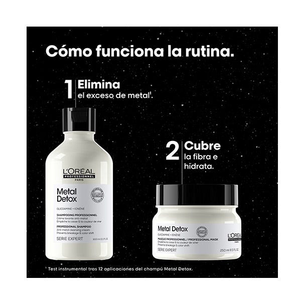 Champú Metal Detox (300ml) con una fragancia memorable ayuda a limpiar delicadamente la fibra capilar y a eliminar los depósitos de metales como el cobre. Lava y limpia suavemente el cabello. Elimina los metales acumulados. Intensifica el color del cabello, aportando un brillo intenso. Deja el cabello suave y revitalizado durante 72 horas. Aporta al cabello una textura sedosa. Fragancia memorable con tonos cítricos y de almizcle.