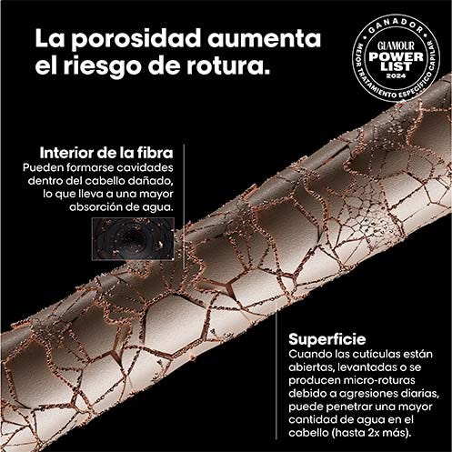 Este tratamiento pre-champú rellena las micro-roturas capilares en 1 uso para una acción anti porosidad y fortalece el cabello poroso para evitar la absorción excesiva de agua. El cabello queda intensamente nutrido, e instantáneamente más fuerte, más brillante y visiblemente saludable.