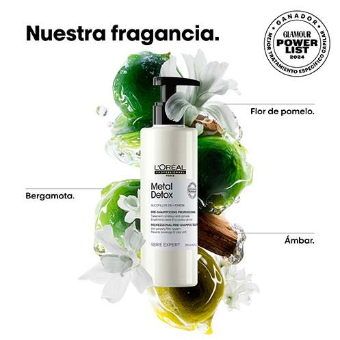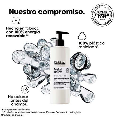 Descubre el tratamiento pre-champú Metal Detox de L'Oréal Professionnel, diseñado especialmente para todo tipo de cabello, coloreados y decolorados. Co-desarrollado con peluqueros expertos, este tratamiento pre-champú combina una serie de beneficios excepcionales para mantener tu cabello en su mejor estado y prolongar la duración de tu color, balayage y decoloración. Evita la rotura y mantén tu color perfecto con la gama Metal Detox, que previene los daños de tu cabello y aporta un brillo duradero.