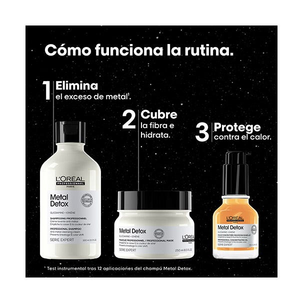 Champú Metal Detox (300ml) con una fragancia memorable ayuda a limpiar delicadamente la fibra capilar y a eliminar los depósitos de metales como el cobre. Lava y limpia suavemente el cabello. Elimina los metales acumulados. Intensifica el color del cabello, aportando un brillo intenso. Deja el cabello suave y revitalizado durante 72 horas. Aporta al cabello una textura sedosa. Fragancia memorable con tonos cítricos y de almizcle.