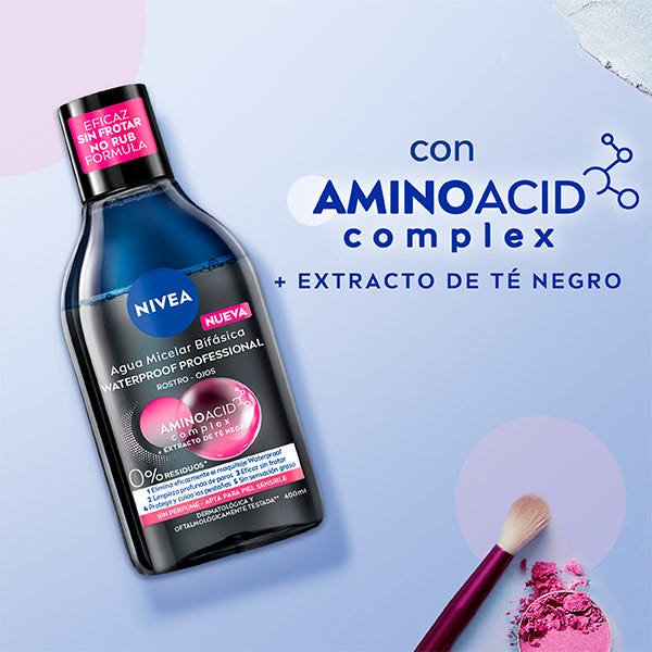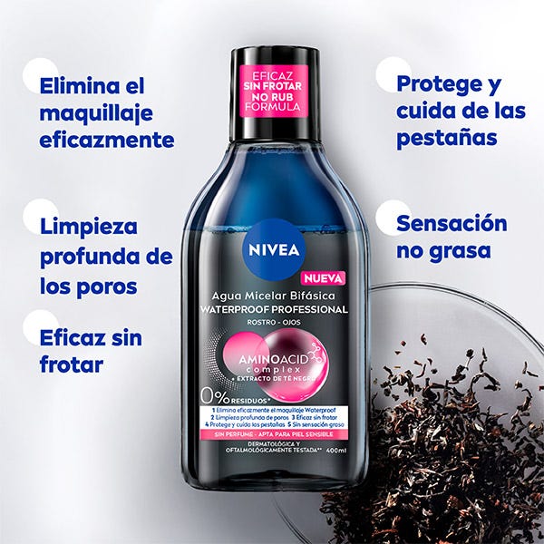 NIVEA Waterproof Professional Agua Micelar Bifásica, adecuada hasta para piel sensible, elimina el maquillaje waterproof, limpia en profundidad los poros y protege y cuida de las pestañas dejando 0% de residuos y sin sensación de piel grasa. Su fórmula Waterproof Professional con Amino Acid Complex y Extracto de Té Negro está enriquecida con Micelas limpiadoras y Aminoácidos. Elimina el maquillaje, las impurezas y la suciedad de manera eficaz, en unas pocas pasadas y sin necesidad de frotar.