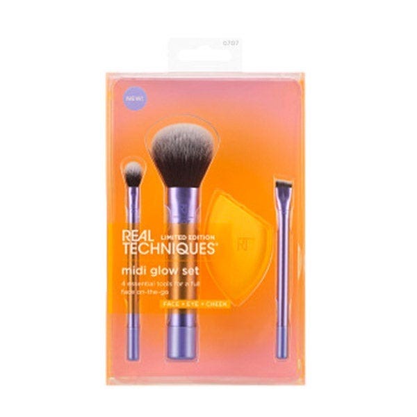 El Midi Glow Set de Real Techniques tiene 4 herramientas esenciales para lograr un brillo total en cualquier lugar. El set de brochas y esponjas de maquillaje incluye la brocha cónica para sombras 359, la brocha multiusos 407, la brocha angular para delineador 356 y una esponja Miracle Complexion. Las dos brochas para sombras de ojos y la brocha multiusos cubren casi cualquier necesidad de definición del rostro, mientras que la esponja Miracle Complexion hace que difuminar los productos en crema sea rápido y sencillo. Estas herramientas multiusos más pequeñas funcionan con la mayoría de los productos líquidos, en crema o en polvo, para que puedas lograr un rostro completo dondequiera que estés. La esponja Miracle Complexion tiene una forma única de aplicación de 3 puntos y está diseñada con una revolucionaria tecnología de espuma sin látex. Maquillaje que te lleva del día a la noche.