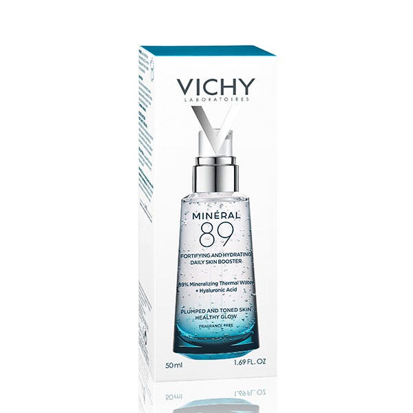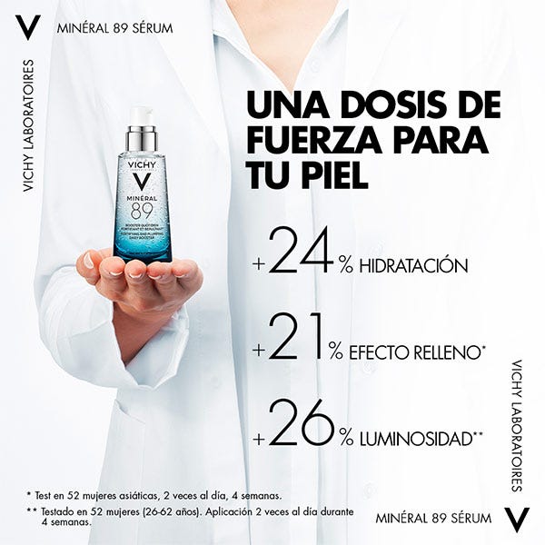 Desarrollado sin perfume y sin alcohol, Minéral 89 de Vichy es un tratamiento de sérum ácido hialurónico en textura fluida con efectos inmediatos de hidratación e iluminación para un rostro siempre radiante y sano.
