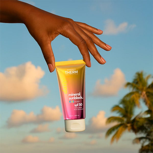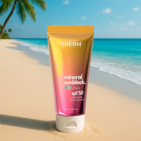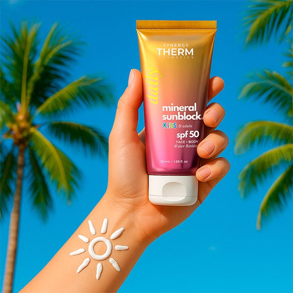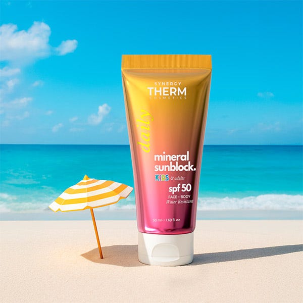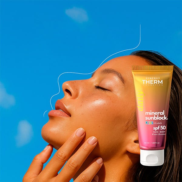 Synergy Therm Mineral Sunblock SPF 50 Kids & Adults es una crema solar 100% mineral, especialmente formulada para brindar una protección eficaz y segura a la piel sensible, sin importar la edad. Enriquecida con óxido de zinc y dióxido de titanio, filtros minerales que reflejan los rayos UVA y UVB, esta crema actúa como una barrera física de protección inmediata.