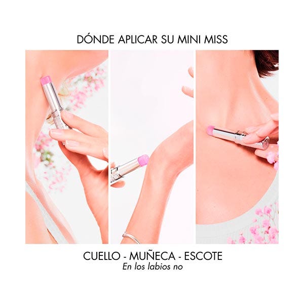 Aplique el stick de perfume en los puntos de pulso (muñecas, cuello y escote), solo o como complemento del perfume en spray. La textura no deja color en la piel, sólo la estela aterciopelada y sensual de Miss Dior Eau de Parfum. No aplicar en los labios.