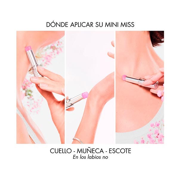 Aplique el stick de perfume en los puntos de pulso (muñecas, cuello y escote), solo o como complemento del perfume en spray. La textura no deja color en la piel, sólo la estela floral, afrutada y amaderada de Miss Dior Parfum. No aplicar en los labios.