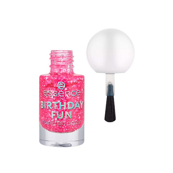 Gran diversión en un frasco pequeño: el mini esmalte de uñas essence. Su juguetón envase con tapón redondo contiene un esmalte de uñas con un ligero efecto de purpurina con matices rosados. Tanto si celebras tu día especial como si quieres sorprender a una amiga, con el práctico esmalte de uñas podrás hacer que cada día parezca una celebración.
