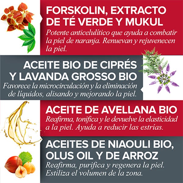 La combinación de sus poderosos extractos anticelulíticos y reductores, los Aceites de Ciprés, Niaouli y Lavanda, Forskolin y el extracto de Té Verde consiguen de forma inmediata que tu piel se transforme en una piel más lisa, con una textura suave, firme y elástica.
