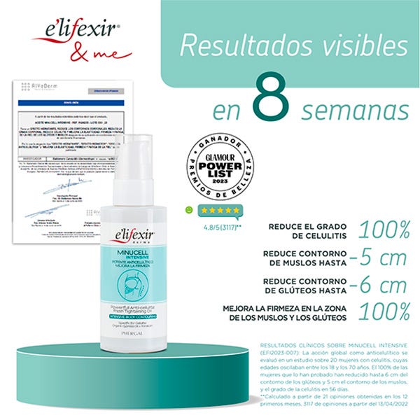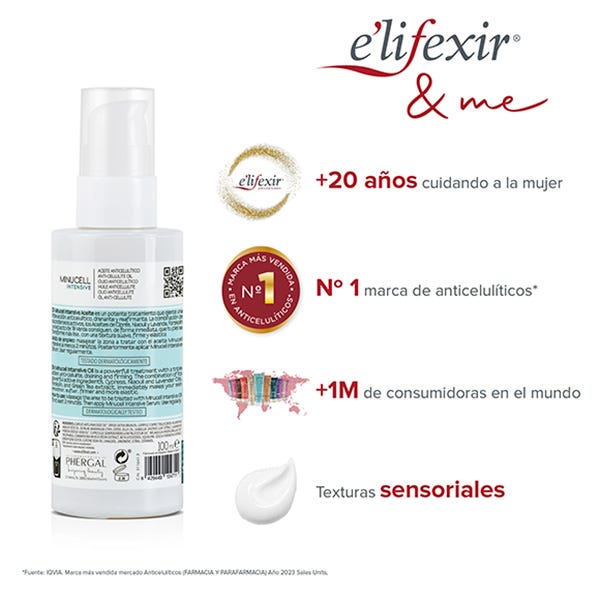 Elifexir Minucell Intensive Aceite es un potente aceite reductor anticelulítico que combate la piel de naranja ejerciendo un efecto triple acción: anticelulítico, drenante y reafirmante que embellece la piel.