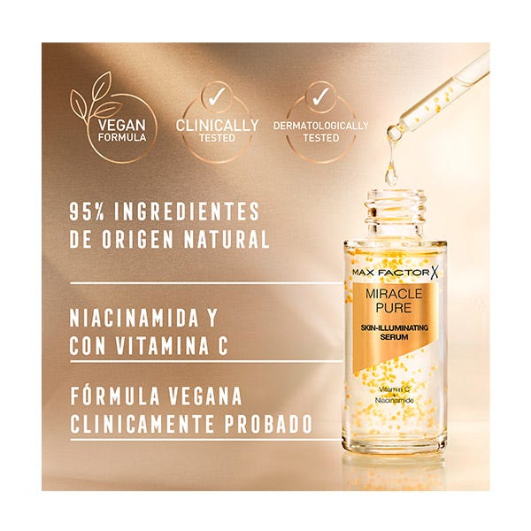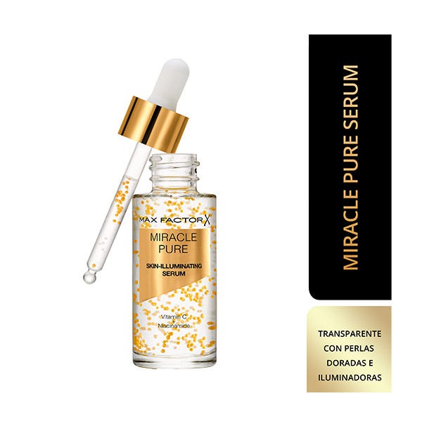 Max Factor presenta el nuevo Miracle Pure Serum un tratamiento de cuidado de la piel que hidrata, ilumina y revitaliza las pieles apagadas y secas. Su fórmula 100% vegana contiene una alta concentración de ingredientes activos como Vitamina C y Ácido Hialurónico que estimula la producción de colágeno. Su uso versátil permite aplicarlo solo, debajo o mezclado con la base de maquillaje para un acabado visiblemente más radiante. ¡No te arrepentirás!