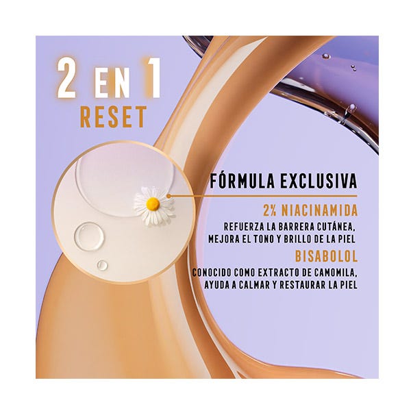 El complejo RESET, impulsado por un 2% de niacinamida y bisabolol, no solo perfecciona la apariencia de la piel al instante, sino que también apoya la barrera cutánea y promueve un tono más luminoso. La niacinamida es conocida por sus propiedades antiinflamatorias y su capacidad para minimizar los poros, mientras que el bisabolol calma y suaviza la piel, haciéndola ideal para pieles sensibles. Esta fórmula ha sido probada clínica y dermatológicamente, garantizando resultados visibles y una experiencia adecuada incluso para las pieles más delicadas.