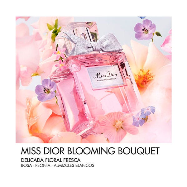 Miss Dior Blooming Bouquet es una fragancia fresca y tierna. Compuesta como un ramo de flores recién abiertas, esta eau de toilette se distingue pour sus notas de rosa, peonía, bergamota y almizcles blancos. Facetada y espontánea, su estela rica en contrastes posee el fervor de un flechazo.