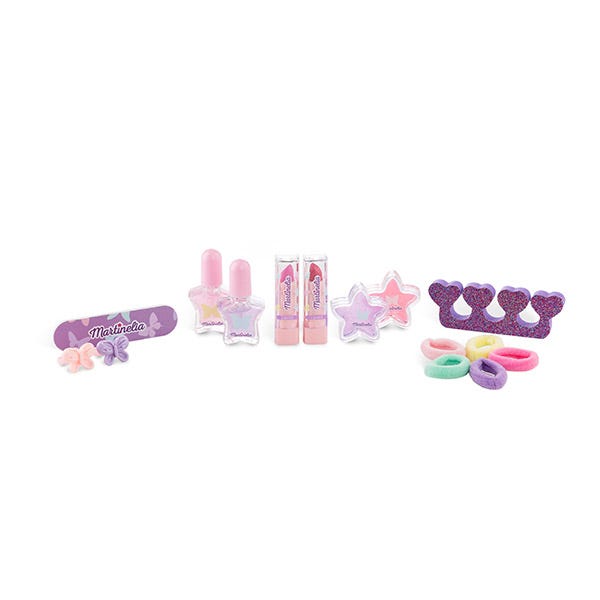 ¡L@s peques de la casa no querrán salir a la calle sin su mochila preferida! Este kit incluye 2 esmaltes de uñas con purpurina, 2 brillos de labios con purpurina (uno de fresa y otro de uva), 2 pintalabios, 5 gomas para el pelo, 2 anillos con forma de mariposa, una lima y un separador para pedicura. ¡Purpurina al poder!