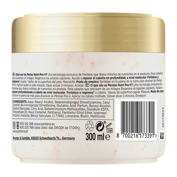 Descubre la mascarilla capilar intensiva con biotina de Pantene Bond Repair. Si tu pelo necesita un milagro, nuestra mascarilla intensiva Bond Repair ayuda a regenerar los enlaces capilares a nivel molecular. El pelo queda visiblemente más sano, fortalecido y reparado*. Esta fórmula exclusiva está enriquecida con biotina y más de 5.000 Perlas Nutri Pro-V, que se disuelven al instante en el pelo. Nuestra colección Bond Repair está diseñada para transformar el aspecto del pelo dañado*. Para obtener mejores resultados, combínalo con el resto de productos de la colección Bond Repair. *daños superficiales