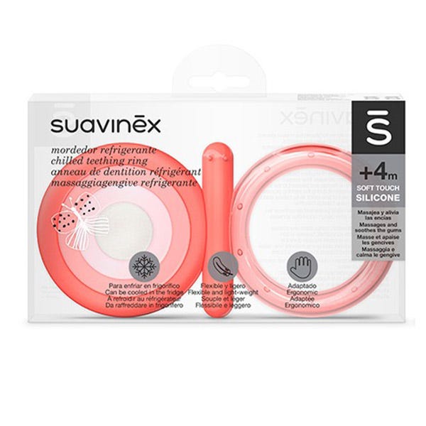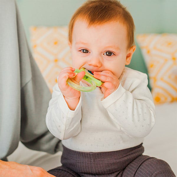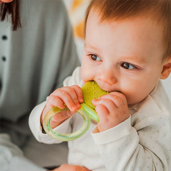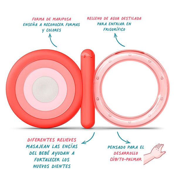 Mordedor dentición con distintos relieves que masajean las encías del bebé y ayudan a fortalecer los primeros dientes.