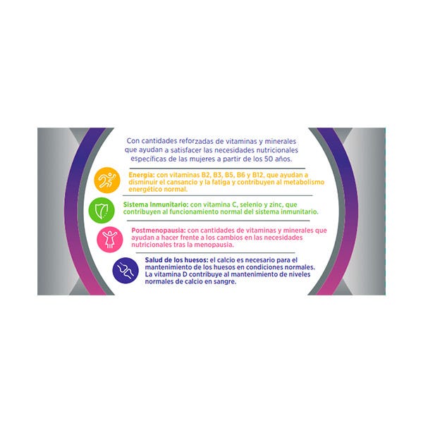 Fórmula específicamente equilibrada con cantidades reforzadas de vitaminas y minerales que ayudan a satisfacer las necesidades nutricionales de las mujeres a partir de 50 años.