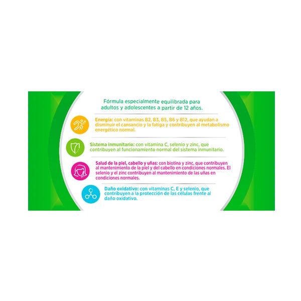 Complemento alimenticio con vitaminas y minerales que ayuda a cubrir los requerimientos nutricionales de adultos y adolescentes a partir de 12 años.