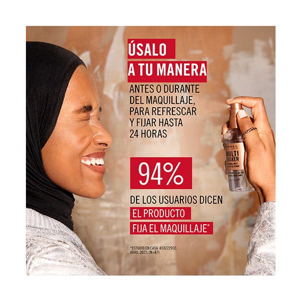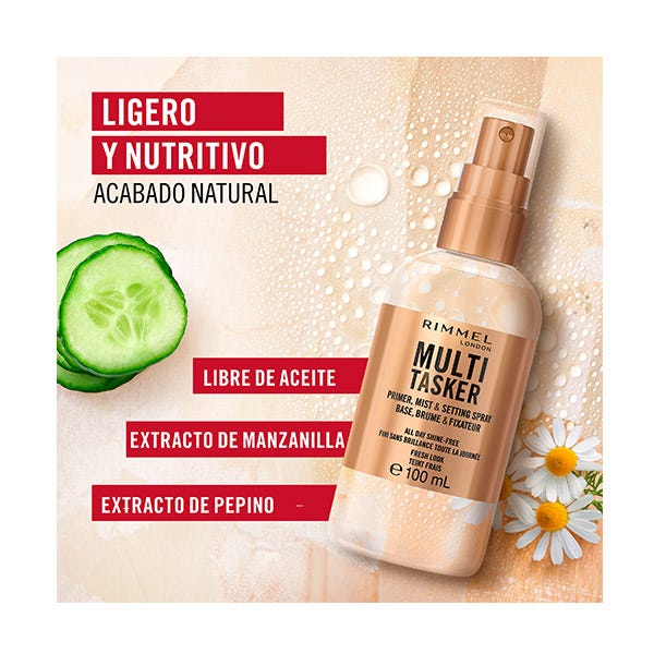 Rimmel 3 en 1 Multi-Tasker Wake me up Primer, Mist & Setting Spray prepara tu cutis, refresca tu piel y tiene poder fijador durante todo el día. Primer vegano para un look fresco que deja la piel libre de brillos durante todo el día. Una bruma para el rostro que deja la piel revitalizada al instante. Este spray fijador mejora el aspecto de la piel apagada y seca, a la vez que la refresca. Refresca tu base y mantiene todo en su sitio, perfecto para cuando necesites refrescarte o darle un empujoncito a tu maquillaje