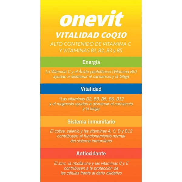 Onevit es una fórmula unisex a base de vitaminas, minerales y coenzima Q10 para aportar vitalidad todos los días.