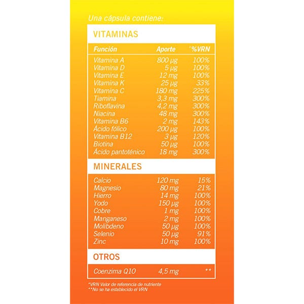 Fórmula exclusiva con 13 vitaminas, 9 minerales y 4,5mg de coenzima Q10.