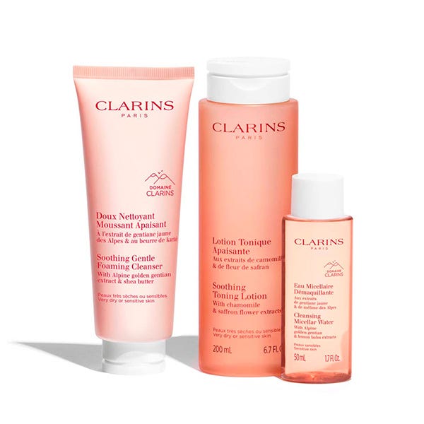 El Cofre Limpieza Pieles Sensibles de Clarins ofrece una rutina completa especialmente creada para cuidar las pieles más frágiles.
