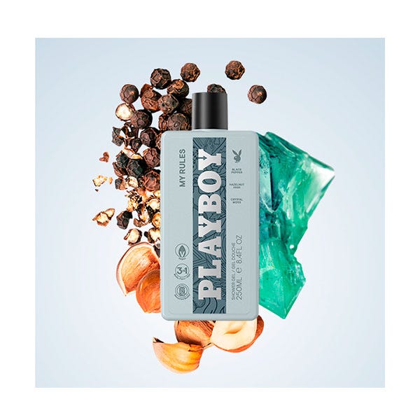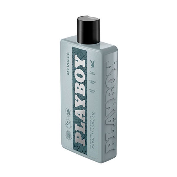 Este gel de ducha 3 en 1 diseñado para el cuerpo, el rostro y el cabello forma parte de la colección de fragancias My Rules. Apta pra veganos. La formulación se presenta en una botella que contiene un 30% de plástico reciclado, excluye ta tapa y etiqueta.