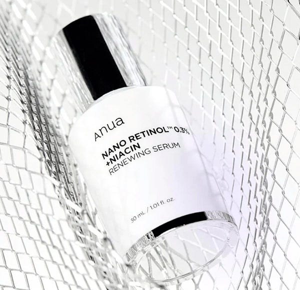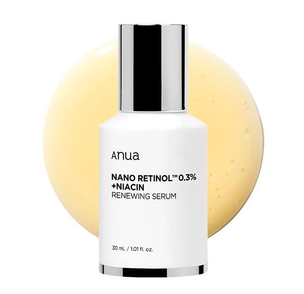 El serum Anua Nano Retinol 0.3% + Niacin Renewing es una solución potente iluminadora que combina Retinol y Niacinamida para difuminar arrugas y manchas de hiperpigmentación, mientras restaura la firmeza de la piel. Se combina con péptidos añadidos para una mayor hidratación y reducción de arrugas, junto con ingredientes como aceite de hoja de árbol de té y ceramida para efectos calmantes e hidratantes, también minimiza los poros y reafirma la piel flácida para un cutis rejuvenecido