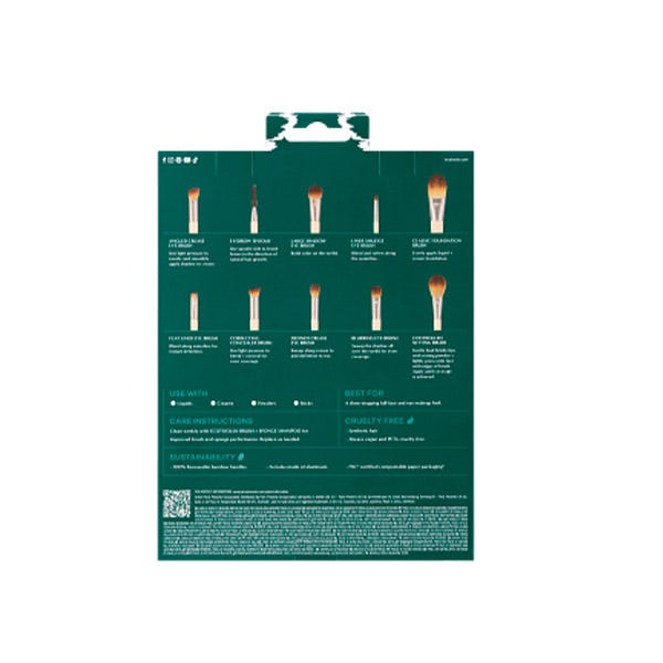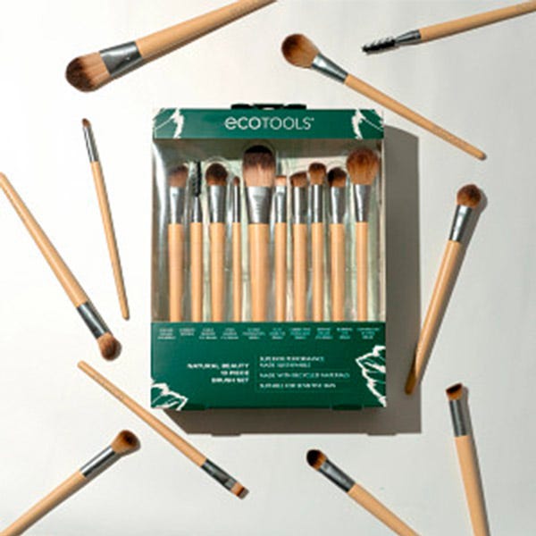 El set de brochas Natural Beauty de EcoTools incluye 10 brochas de maquillaje para un maquillaje espectacular en rostro y ojos. Las brochas se pueden usar con fórmulas líquidas, en crema, en polvo y en barra, como sombras de ojos, corrector, polvos fijadores, base, rubor, bronceador y delineador.