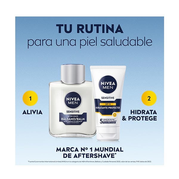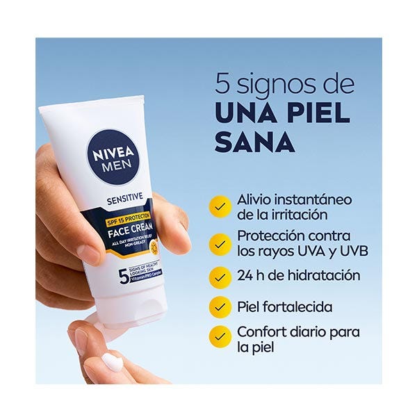 NIVEA MEN Sensitive y el Hidratante Protector Facial FP15: Aplicar sobre la piel limpia del rostro hasta su completa absorción. Evitar la zona de los ojos.