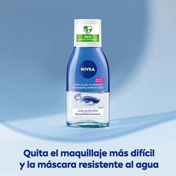 NIVEA Desmaquillador de Ojos Doble Acción 125ml: Aqua, Isododecane, C15-19 Alkane, Isopropyl Palmitate, Ethylhexyl Cocoate, Glycerin, Dicaprylyl Ether, Biotin, Centaurea Cyanus Flower Extract, Helianthus Annuus Seed Oil, Tocopherol, Caprylyl/Capryl Glucoside, Sodium Chloride, Sodium Hydroxide, Trisodium EDTA, Phenoxyethanol, Benzethonium Chloride, CI 60725, CI 61565.