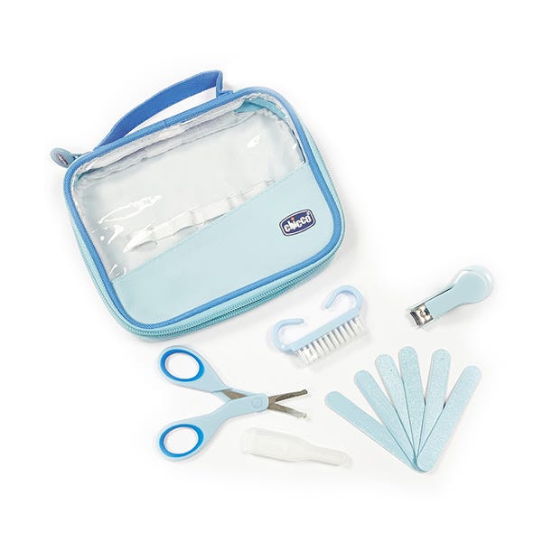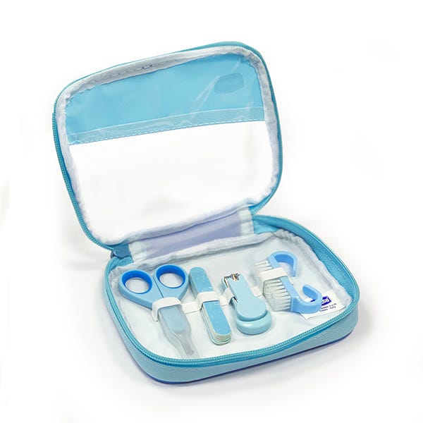 Práctico neceser que recoge todo lo necesario para el cuidado de las manos de uñas del bebé.