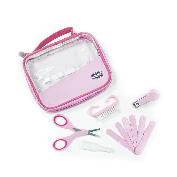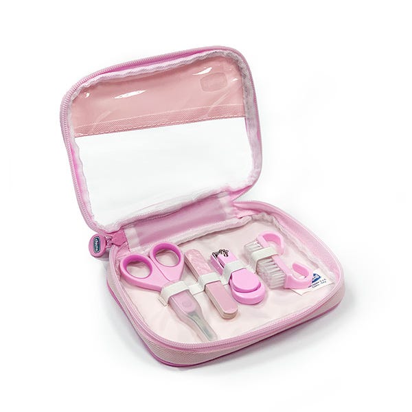 Práctico neceser que recoge todo lo necesario para el cuidado de las manos de uñas del bebé.