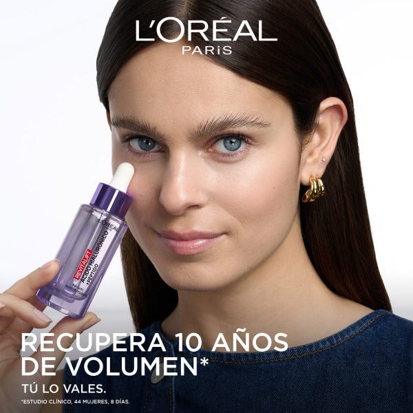 Descubre el poder del Sérum Revitalift Filler Hialurónico 30ml de L'Oréal Paris, un tratamiento antiarrugas clínicamente probado con un 1,5% de ácido hialurónico puro en tres formas: macro, micro y micro-epidérmico. Su fórmula actúa en múltiples capas de la piel para hidratar profundamente, rellenar visiblemente las arrugas y mejorar progresivamente la apariencia de la piel madura. La textura líquida ultraligera se absorbe rápidamente, dejando el rostro suave, luminoso y revitalizado desde la primera aplicación. Con vitamina Cg y glicerina, este sérum ilumina, hidrata y revitaliza el rostro mientras previene la aparición de nuevos signos de envejecimiento. Ideal para pieles con pérdida de volumen y arrugas profundas, se aplica fácilmente antes de la crema hidratante para potenciar sus beneficios.