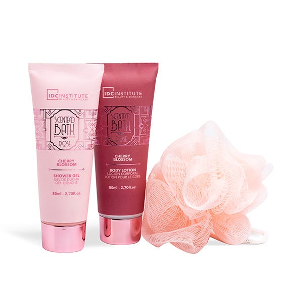 Sumérgete en la experiencia floral con nuestro set de baño Scented Bath Rose. Este encantador neceser incluye una lujosa loción hidratante, un refrescante gel de ducha y una suave esponja, todos perfumados con el exquisito aroma a flor de cerezo. Ideal para disfrutar de un cuidado completo y momentos de relajación perfumados.
