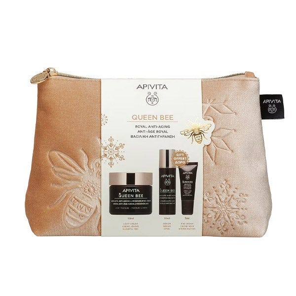 El Estuche Queen Bee de Apivita incluye una rutina completa de tratamiento regenerador antiedad absoluto. Contiene una Crema Antiedad Absoluto con textura ligera, que incorpora jalea real de liberación controlada, diseñada para reducir arrugas, aumenta la firmeza de la piel, restaurar volumen y densidad, así como hidrata y unifica el tono de la piel. También se incluye un Sérum Redensificante Antiedad Absoluto, que proporciona un efecto tensor inmediato y redefine el óvalo facial. Además, el Contorno de Ojos Revitalizante Antiedad Absoluto ayuda a disminuir líneas de expresión y arrugas profundas, eleva los párpados y reduce bolsas y ojeras.