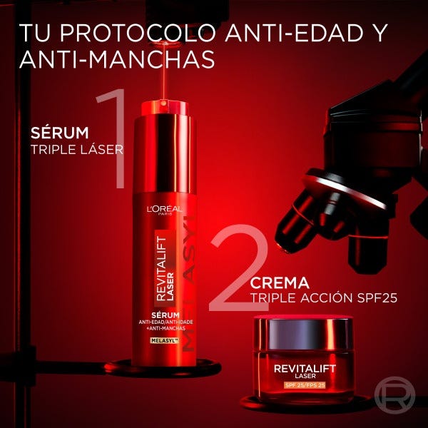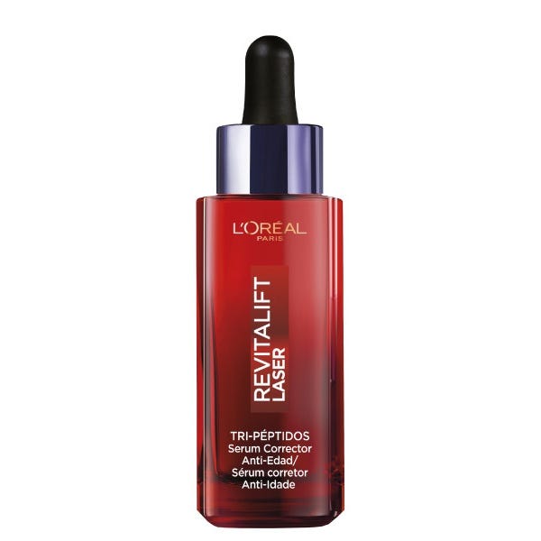 L'Oréal Paris Sérum Corrector Anti-Edad Revitalift Laser Tri-péptidos + Ácido Hialurónico + Vitamina Cg combina activos anti-edad de referencia. Resultados visibles en 2 semanas* en líneas de expresión, firmeza y luminosidad. Aplicar por la mañana y por la noche, solo o antes de la crema Revitalift Laser, sobre la piel limpia con movimientos ascendentes.