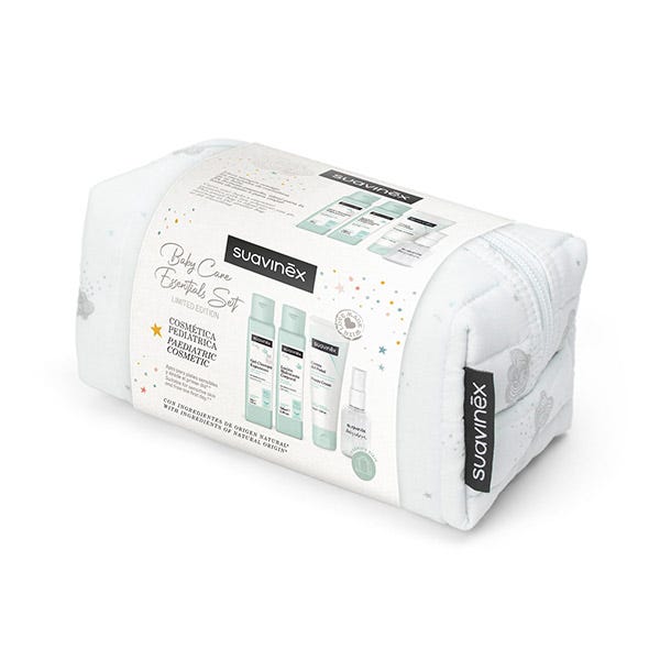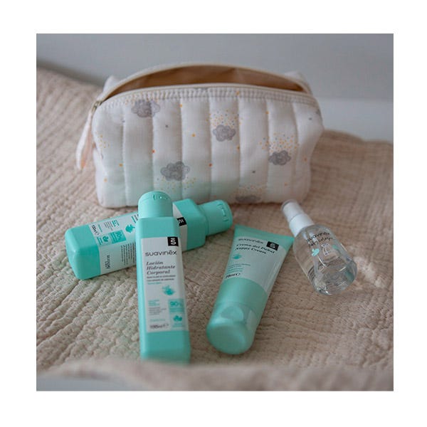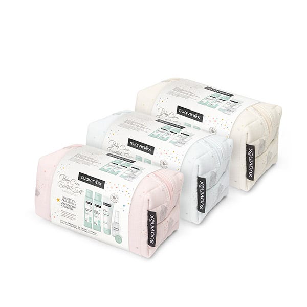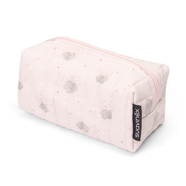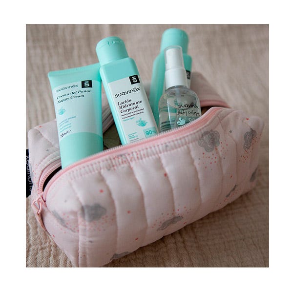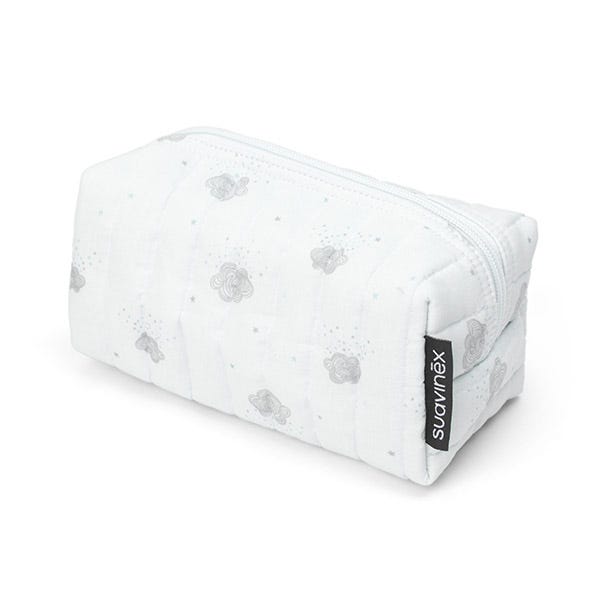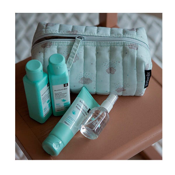Precioso neceser de tela en formato viaje para bebé recién nacido de Suavinex. Reúne todos los productos imprescindibles para el cuidado de tu bebé.