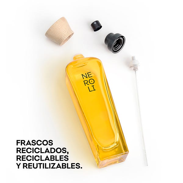 Hecho con vidrio reciclado, reciclable y reutilizable de por vida, gracias al nuevo sistema de rosca. Nuestro tapón es 100% de madera FSC y 0% plástico. Etiqueta de papel FSC procedente de bosques bien gestionados. Un diseño atemporal y único para toda la colección hecho en España.