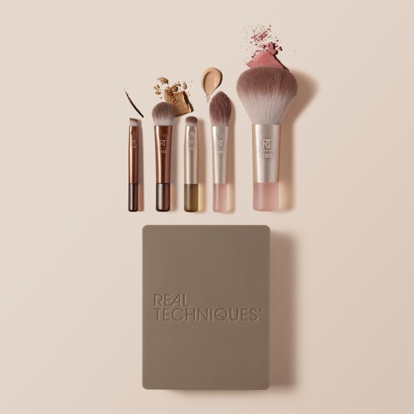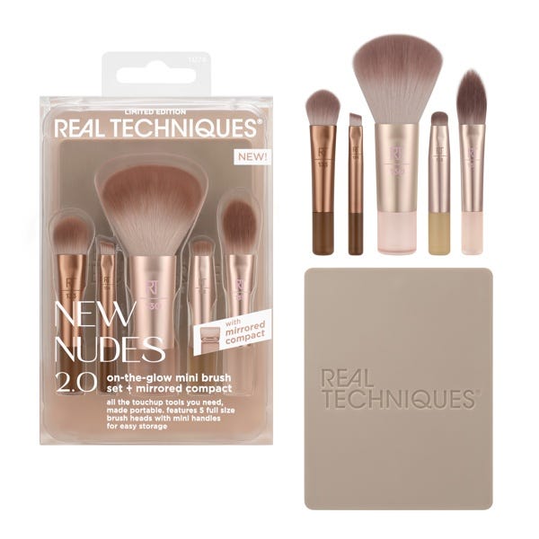 El set de mini brochas de maquillaje New Nudes 2.0 On-The-Glow + Mirrored Compact de Real Techniques tiene todas los accesorios de retoque que necesitas, hechas portátiles. Esta colección de edición limitada ha vuelto y mejor que nunca porque los nudes nunca pasan de moda.