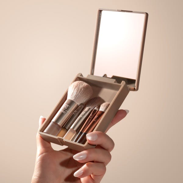 El set de brochas de maquillaje incluye la brocha multitarea mini 130, el pincel mediano para sombras mini 133,el pincel para difuminar mini 132, el pincel definidor mini 134, la brocha Kitten Paw mini 131 y un espejo compacto ADICIONAL.