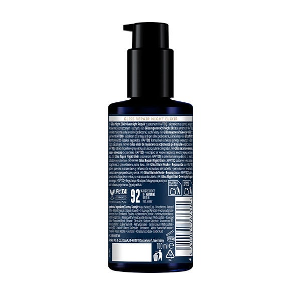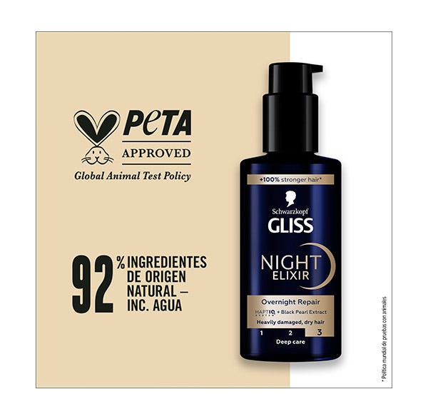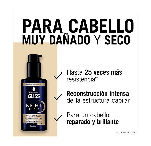 Desarrollado para cabellos muy dañados y secos, Night Elixir Reparación contiene Extracto de Perla Negra + HaptIQ System, que crea microenlaces y fortalece la estructura del cabello, proporcionando hasta 25 veces más resistencia* y brillo (*vs. cabellos sin tratar).