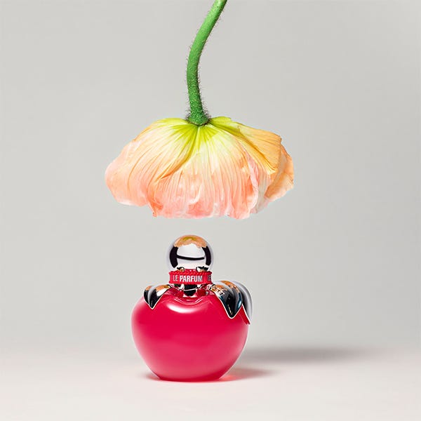 El icónico frasco en forma de manzana de Nina adopta una vibrante tonalidad rosa pop y, como bellísimo toque final, está realzado con una cinta rosa texturizada inscrita con letras plateadas.