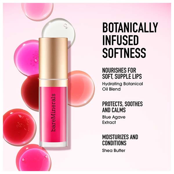 El primer aceite labial ultrahidratante y no pegajoso de bareMinerals está compuesto por una mezcla única de 9 aceites botánicos y ácido hialurónico que calman y acondicionan para conseguir unos labios tersos, suaves y con un aspecto saludable.